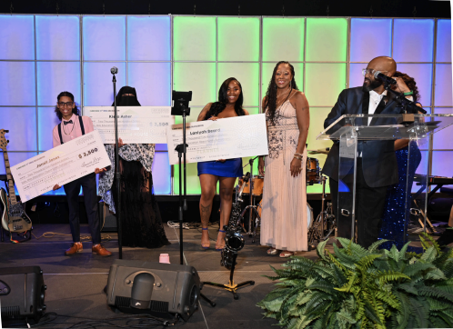 Pictured (left to right): Sarah Zike (CFO), Sherry Holmes (Winner), Nia-Morgan Hayes (Winner), Debra White (COO), and Dr. Brandon Cosby (CEO)